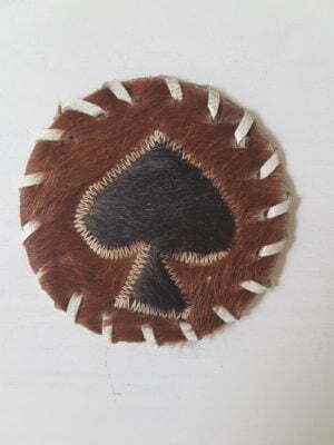 Mooie onderzetter van koeienvacht maat M, diameter 12 cm.