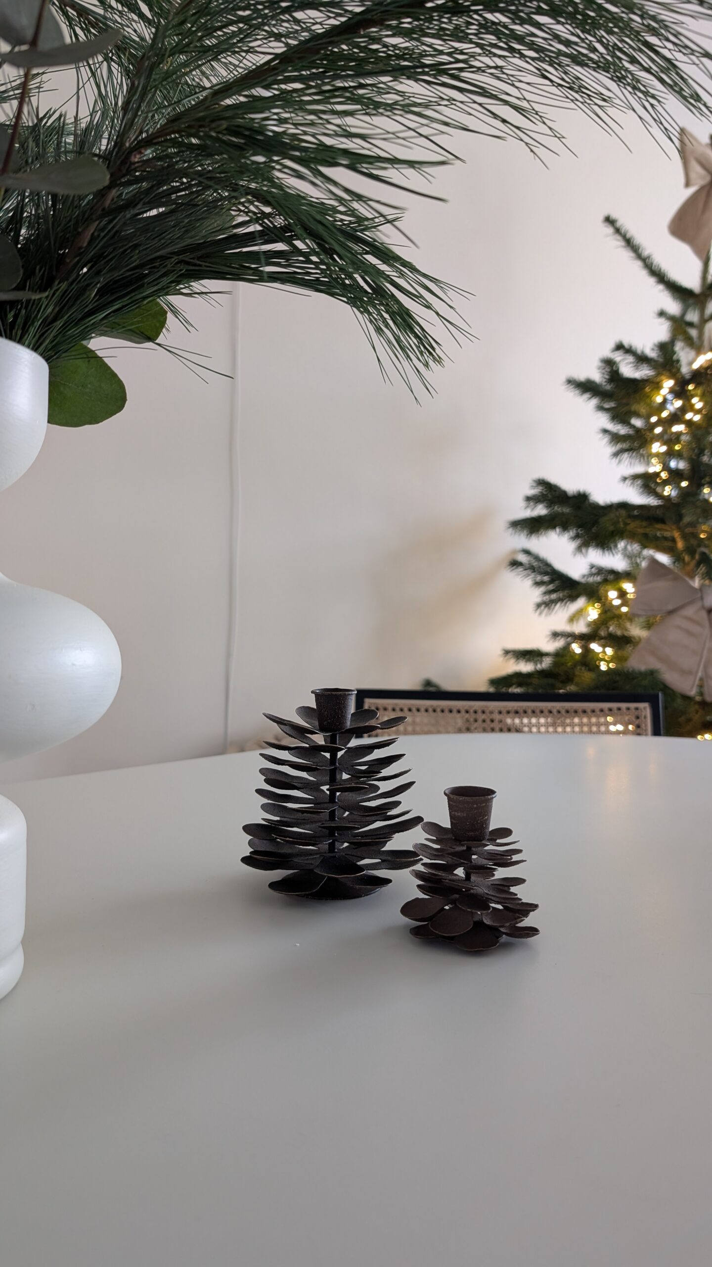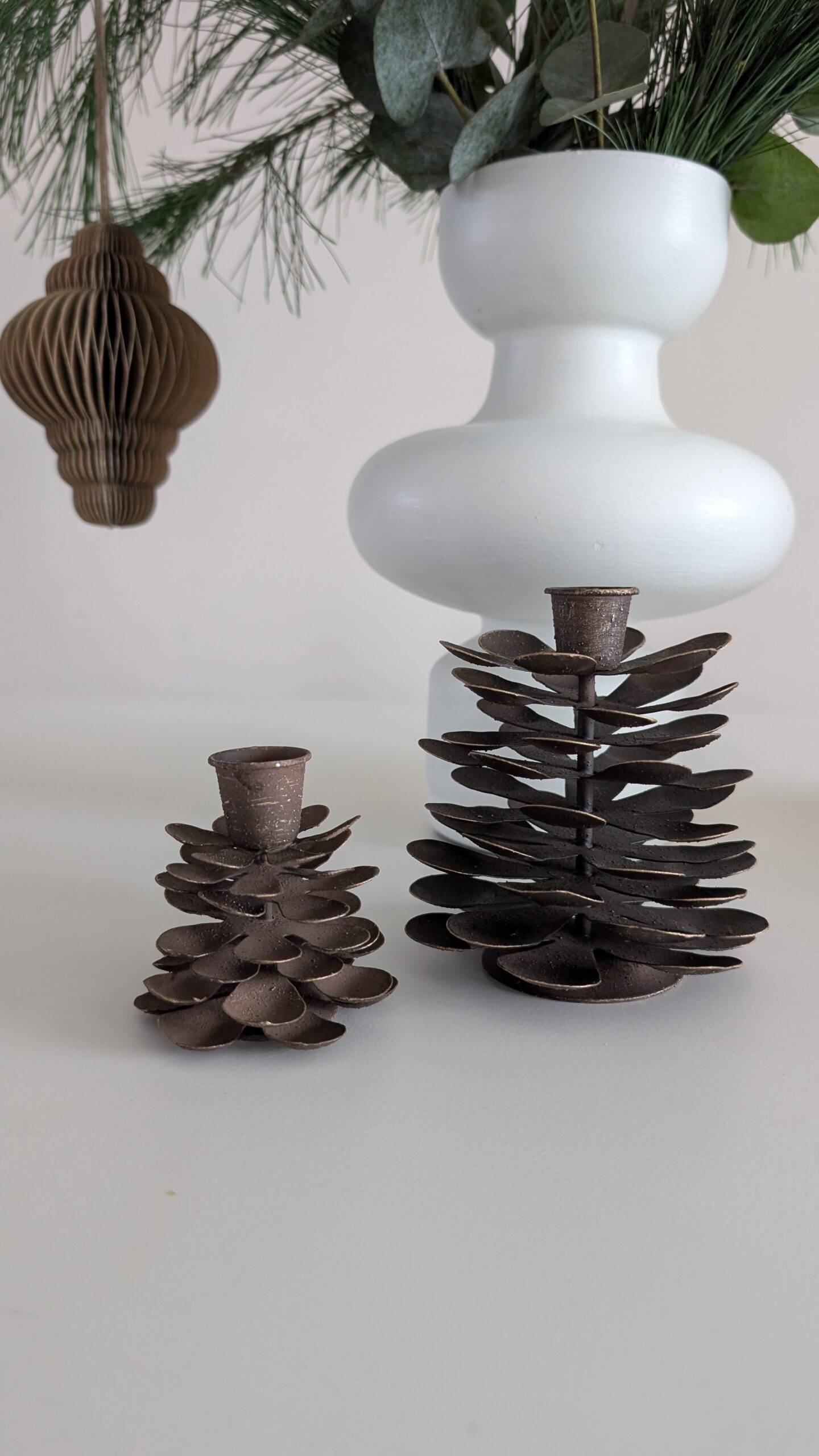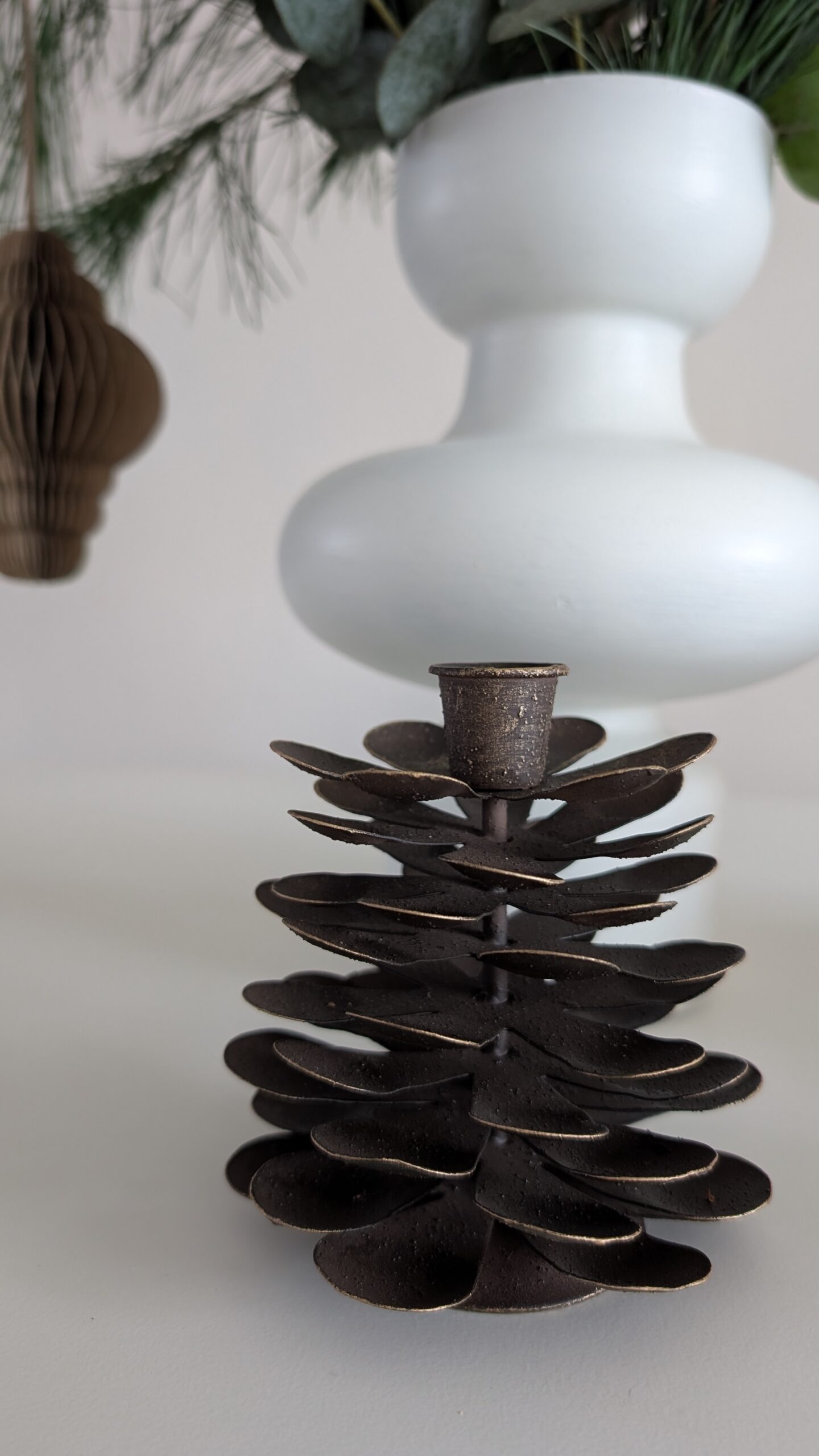Maak je kersttafel compleet met deze leuke roest kleurige kandelaar in een dennenappel vorm.