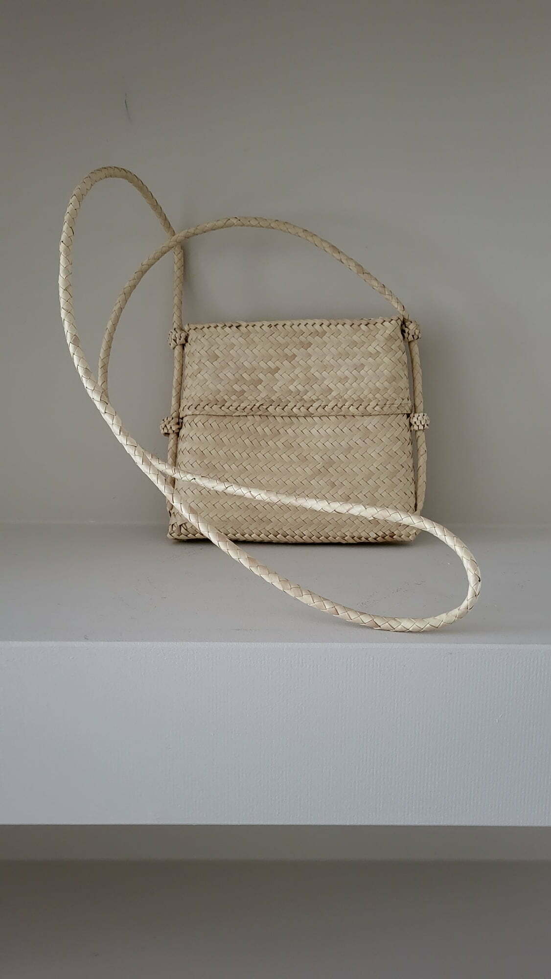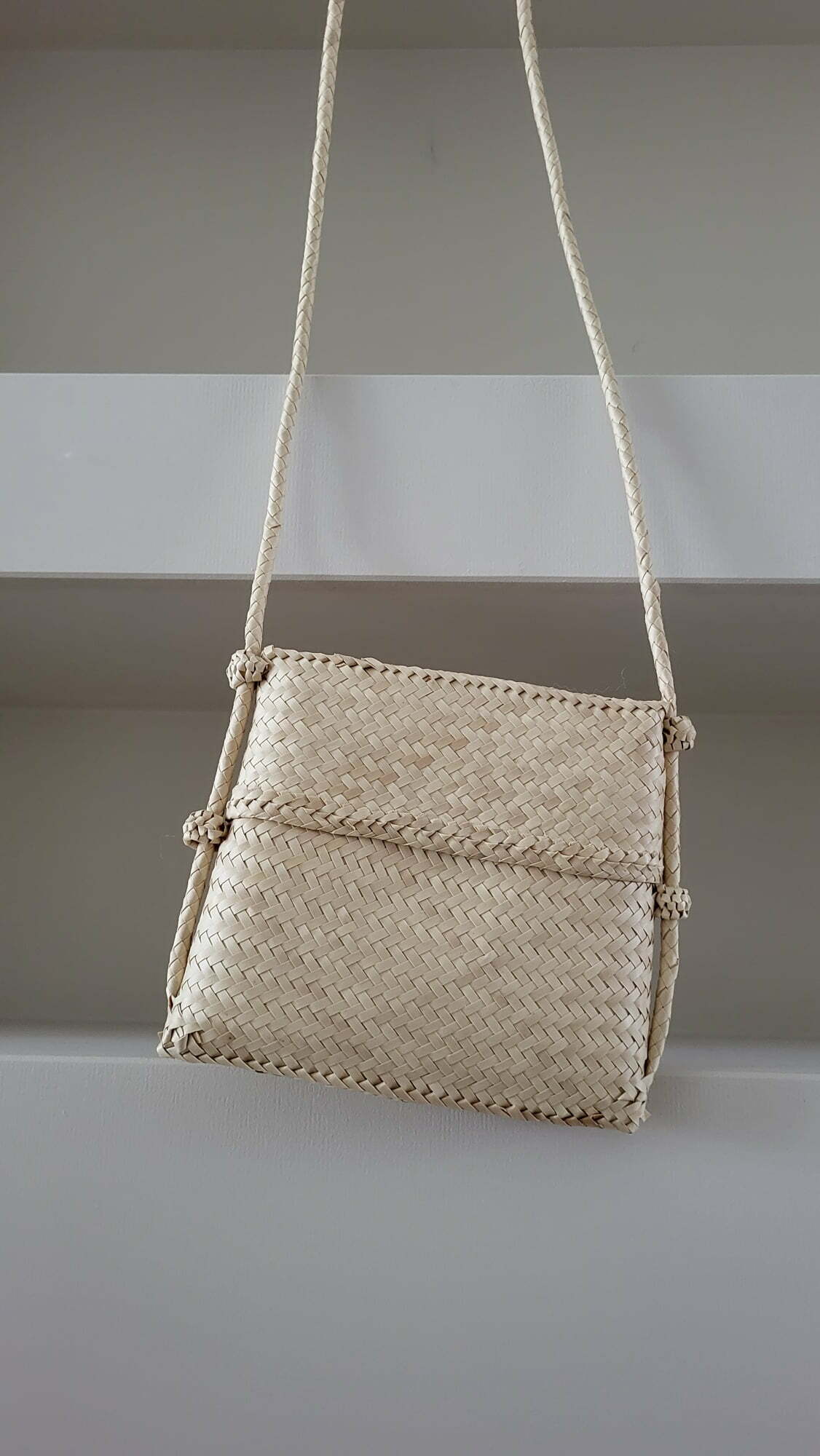 Tasje van palmblad, ca 16×19 cm.