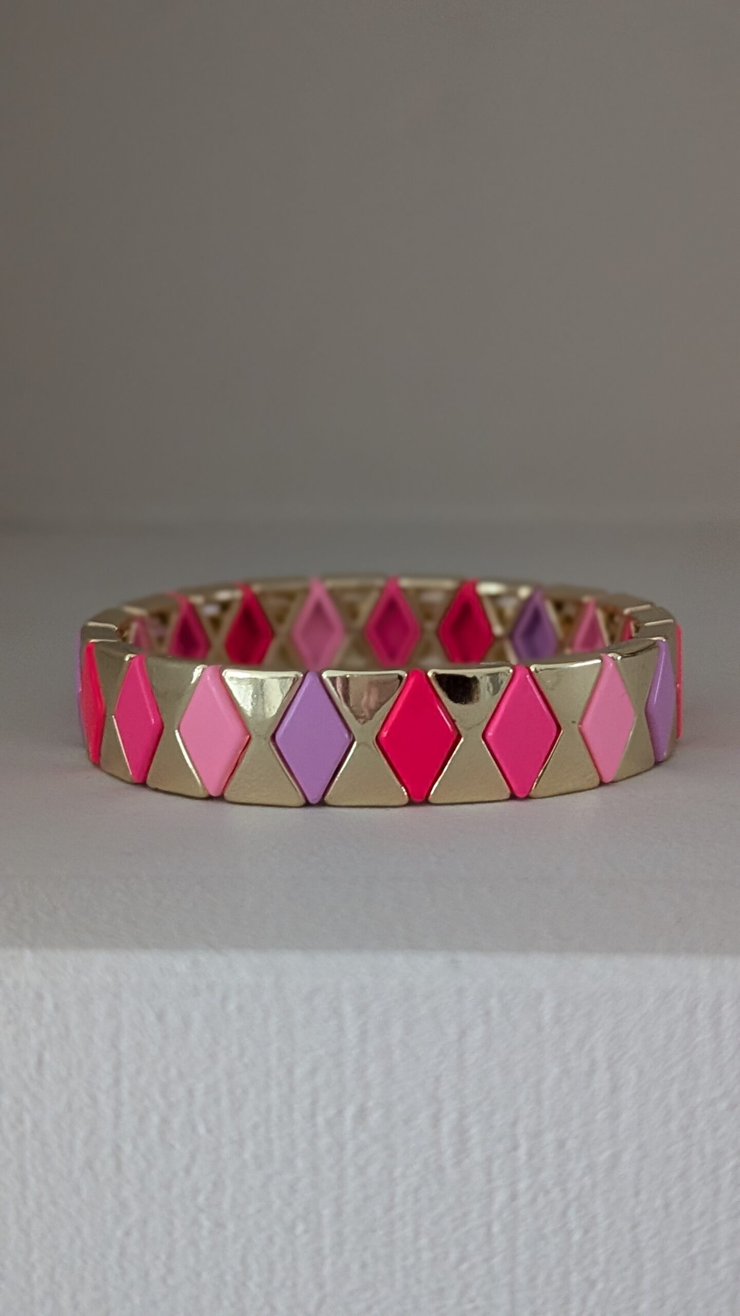 In een mooie kleurencombinatie met goud, paars en verschillende kleuren roze.