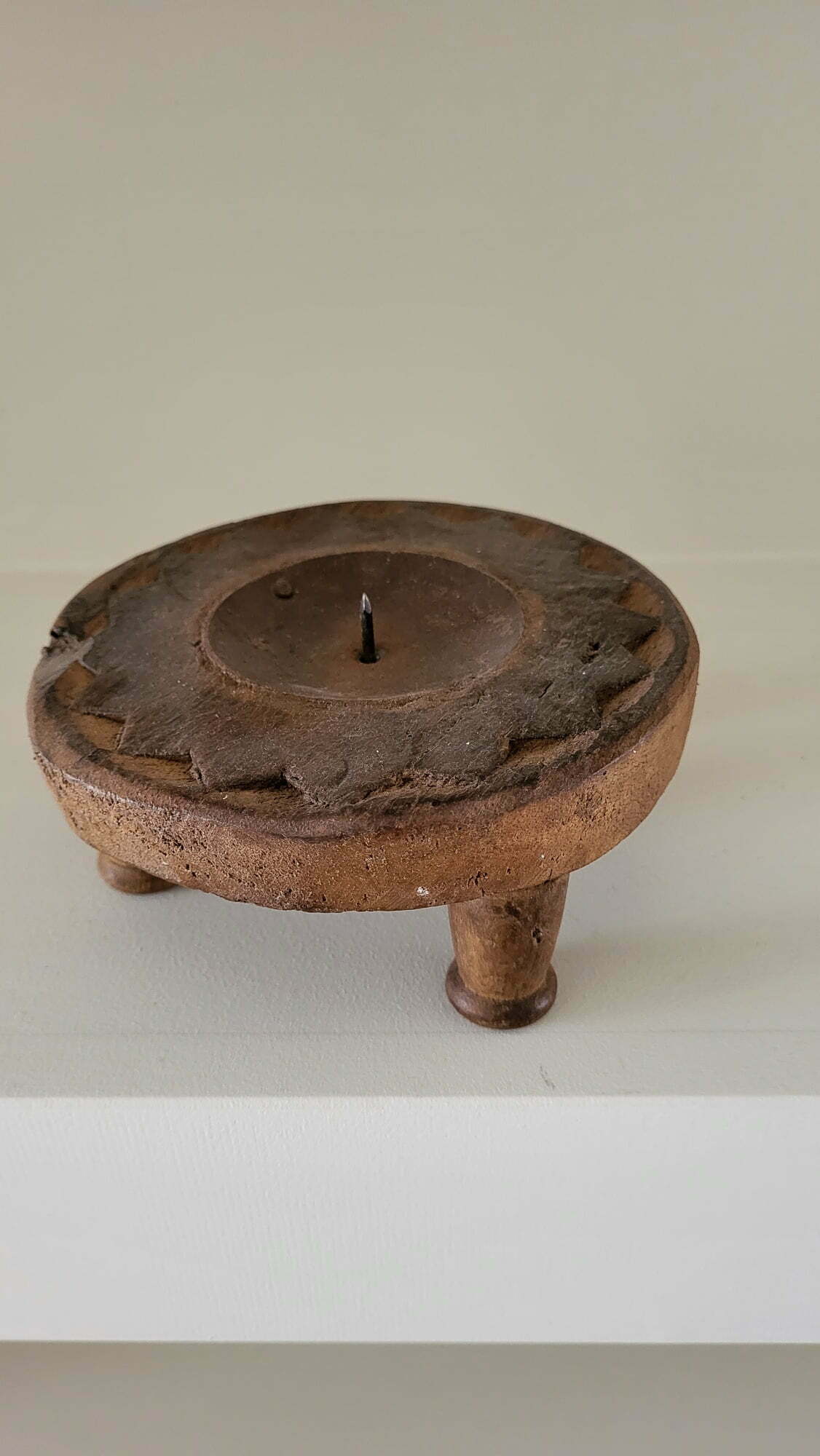 Kaarsenhouder van oud hout op pootjes. Doorsnee ca 15 cm.