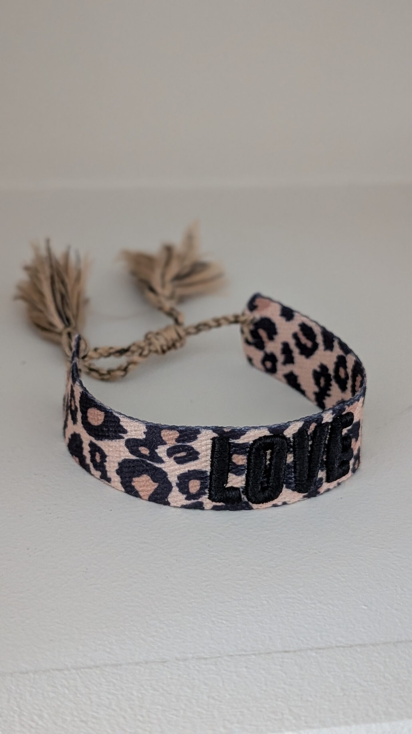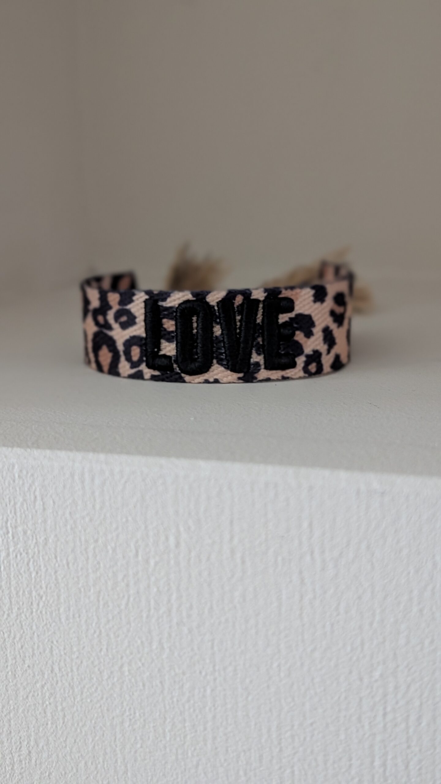Zwarte tekst op een leuk panterprint armbandje, met een koortsluiting.