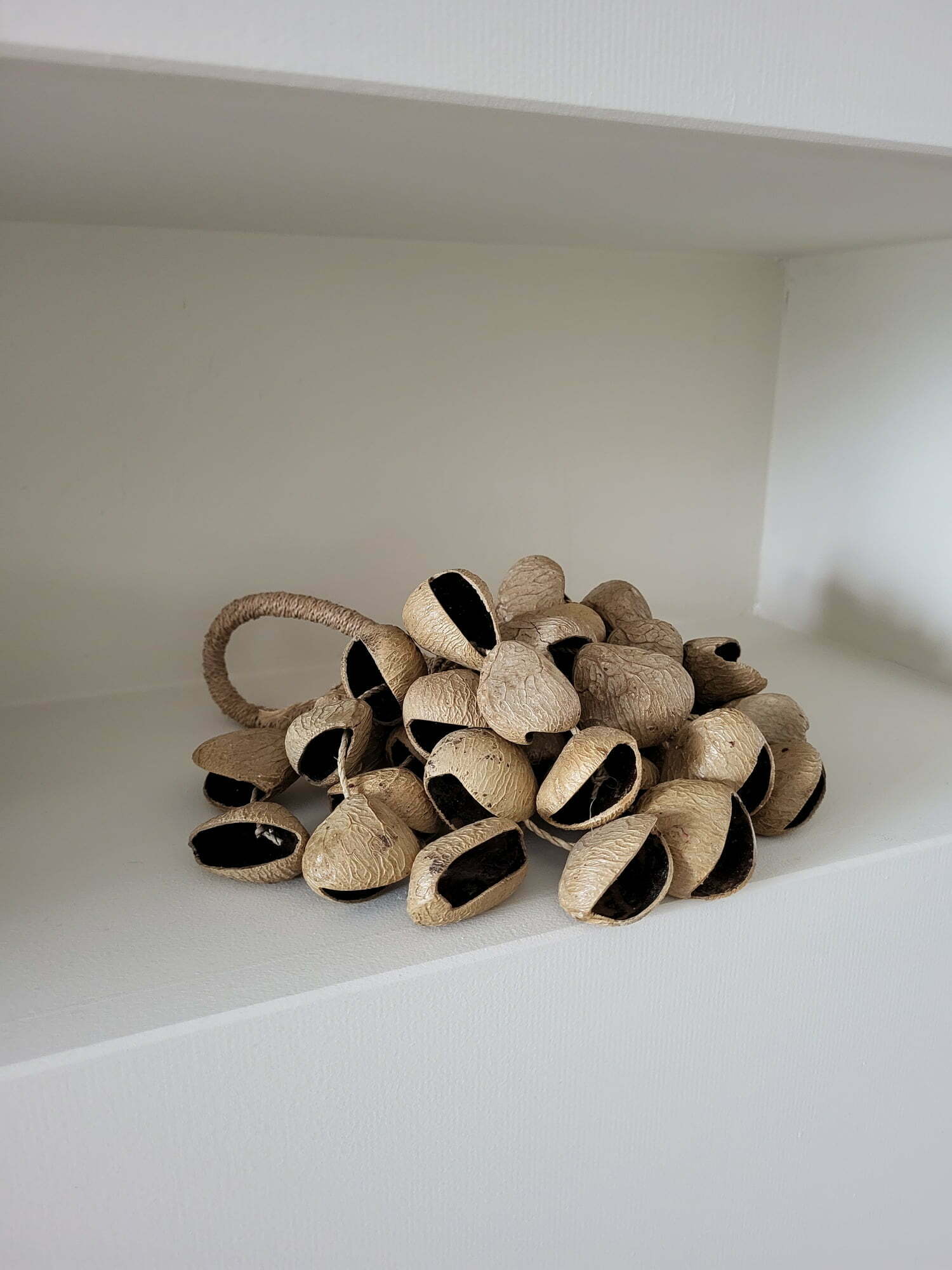 Door de gedroogde noten krijg je een leuk geluid als ze tegen elkaar aan komen