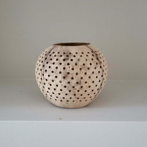 Kokosnoot windlicht met stippen zonder glas. Opening aan boven en onderkant kokosnoot. Handgemaakt in Bali.