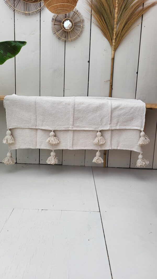De pompoms zijn in dezelfde kleur als de deken en zitten aan de korte zijde aan beide kanten.
