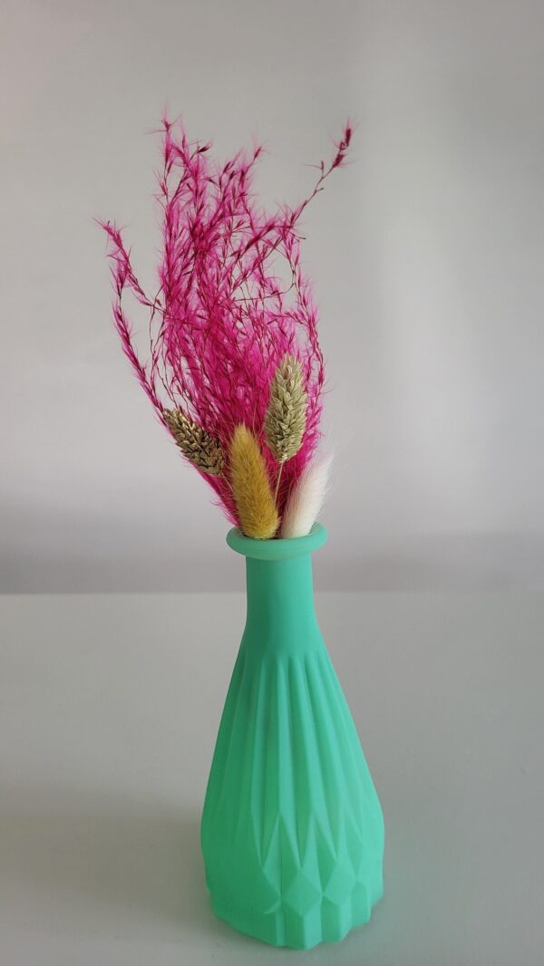 Combineer deze leuke vaas bijvoorbeeld met de andere varianten de lila kleur of de mooie zachte gele.
